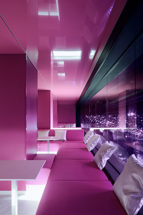 与其他夜总会商务KTV设计一样,炫目的灯光是主要元素。不同的是,这个项目的灯光不是大片的渲染、切换方向,而是以点、圈和线条的形式混合变幻。吊顶的灯光变化多端,地板顺势采用纵向条纹拼接的图案,延长了视觉效果。